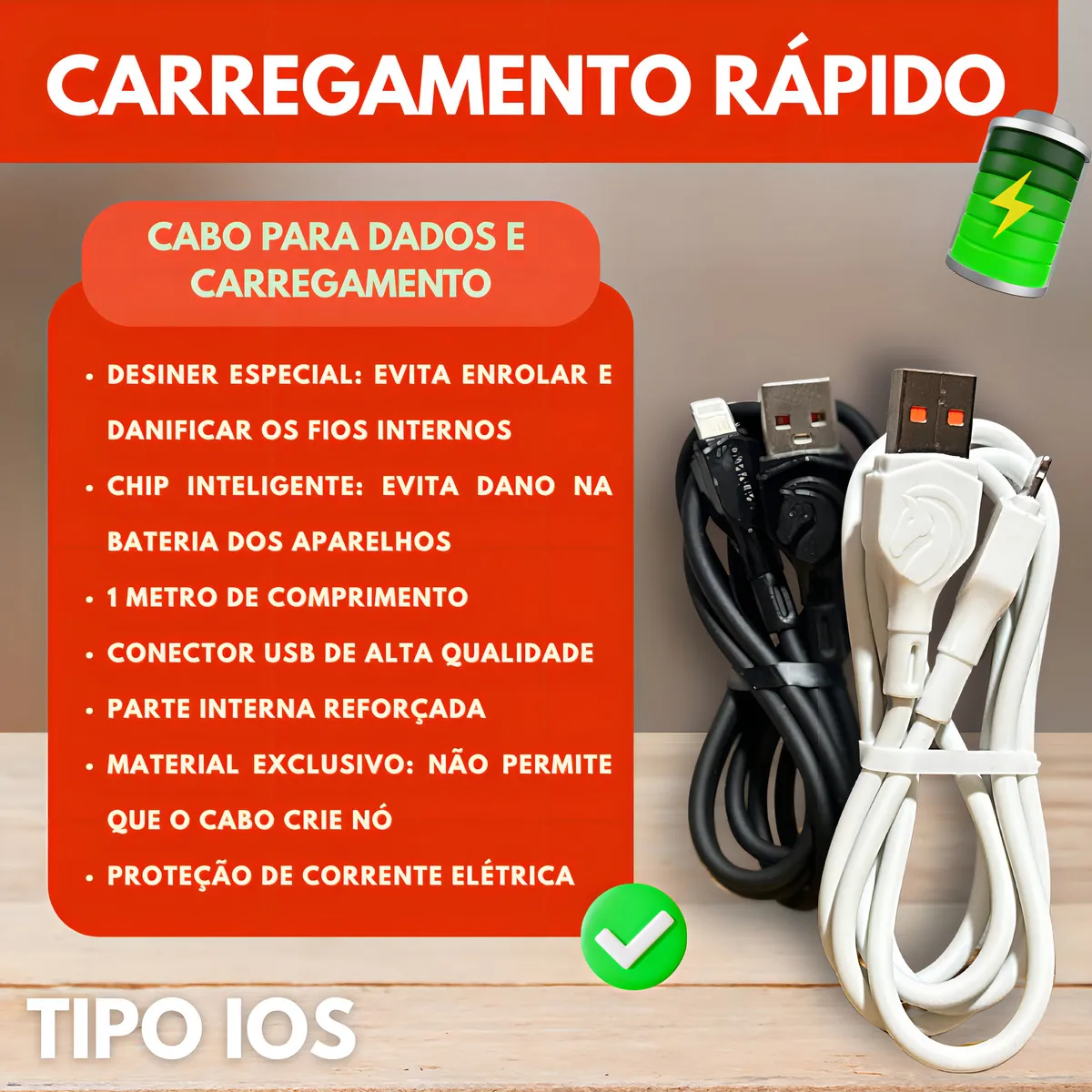 O cabo possui fio de alta qualidade e construção reforçada, ajudando a proteger o aparelho durante o carregamento. Conta com controles internos de energia e temperatura, além de projeto pensado para reduzir interferências e oscilações. O conector USB é resistente e projetado para uso prolongado, com encaixe firme na porta do carregador ou computador.